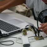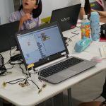今回は36名の親子が参加し、新しく開発した「無線通信モジュール」と「レーザ式距離センサ」を活用して「人が近づいたらまわりはじめる扇風機」などの装置を実現するためのプログラミングにチャレンジしました。